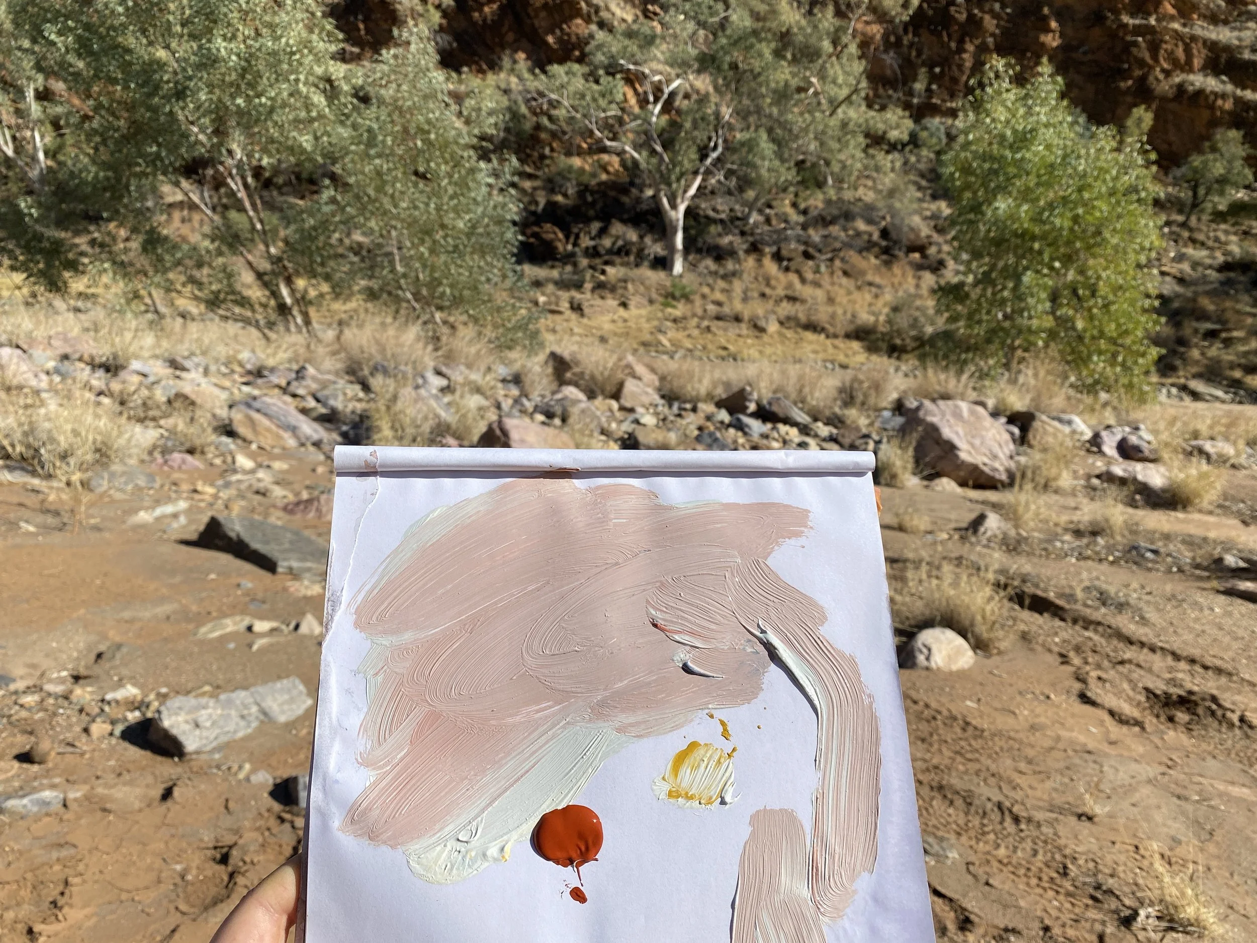 Slow Dance is a body of work that unveils my experience at the East MacDonnell Ranges, Arrernte Land, Central Australia. Earlier this year, eight other practicing artists from around the country and myself camped at Ruby Gap, 400 km from Alice Springs, where we painted immersed in the landscape. From this inspirational trip, I focused on capturing the energy of place and painted from sketches, images, and memory. Some artworks depict a sense of quiet and stillness of waking up before the group, while others channel the higher energy felt in the riverbeds at sundown as we gathered around the fire for a wine. I felt a strong connection to Trephina Gorge, it was nurturing and feminine, just like a warm hug from my mother or nona. It was as if this ancient land was asking you sink into it and feel completely at ease. I noticed that I was painting slower and more mindfully there. The midday sun was warm, and the shadows were deep. After a week of being remote and disconnected from the digital world, I suddenly sensed the increase of pace on my return to the city. I then knew I wanted to call this work 'Slow Dance' to seize the feeling of The Central Desert. These paintings intend to remind us to slow down, take a breath, and dance in the kitchen!